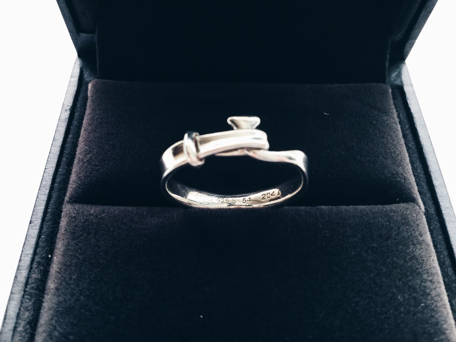 写真の通り、上部は「鍵」の様に引っかけるデザイン。ブレスレットなどは中央部が開閉可能になっておりますが、残念な事に指輪ではそれができません。しかし、指輪でこのデザインを行っているのはこの世でジョージジェンセンのみと聞きます。他の候補ブランドが落選した理由はシルバーの面積にあります。面積が広ければ広いほど素材の曇りや、主張が大きくなり、それが他の指輪へ悪影響(見た目)を及ぼします。また、複雑なデザイン物ほど、入り組んだ作りになっており、個人レベルでの磨きが行き届かなくなります。